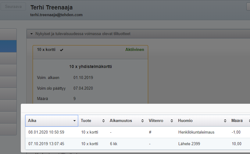 Tässä ohjeessa käydään läpi, miten kappaleperusteinen eli esim. 10 kerran kortti esimerkiksi kuntosalille / ryhmäliikuntatunneille / hierontaan luodaan. Näitä ohjeita noudattamalla myös varmistat, että kortilla olevat kerrat vähenevät aina, kun asiakas käy treenaamassa. Jos asiakkaalla ei ole voimassa olevaa tilituotetta, voit veloittaa käynnin kassalla Ryhmäajanvarauksen veloittaminen -ohjeen mukaan.