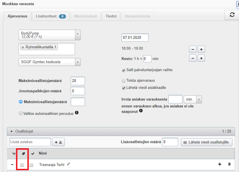Huom! Jos henkilökunta leimaa asiakkaan käynnin manuaalisesti, voidaan haluttaessa myös muuttaa Kulutus-kentän arvoa, eli jos asiakkaan kortilta ei haluta kuluttaa kertoja, muutetaan arvoksi 0. - Leimaa asiakkaan käyntikerta suoraan Ryhmäajanvarauksen muokkaus-näkymästä, kohdasta Osallistujat. Lisää rasti kohtaan "Leimaa sisään":