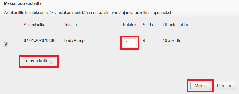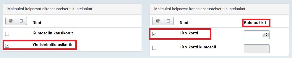 - Jos jollekin palvelulle ei ole valittu kelvolliseksi maksutavaksi kaikkia oikeita tilituoteluokkia, ei asiakas välttämättä voi kuitata osallistumistaan asiakaspäätteen kautta, eikä myöskään henkilökunta pysty leimaamaan asiakasta manuaalisesti tunnille. Maksu asiakastililtä -välilehden tietojen tarkistaminen ja ajan tasalla pitäminen on siis hyvin tärkeää!
