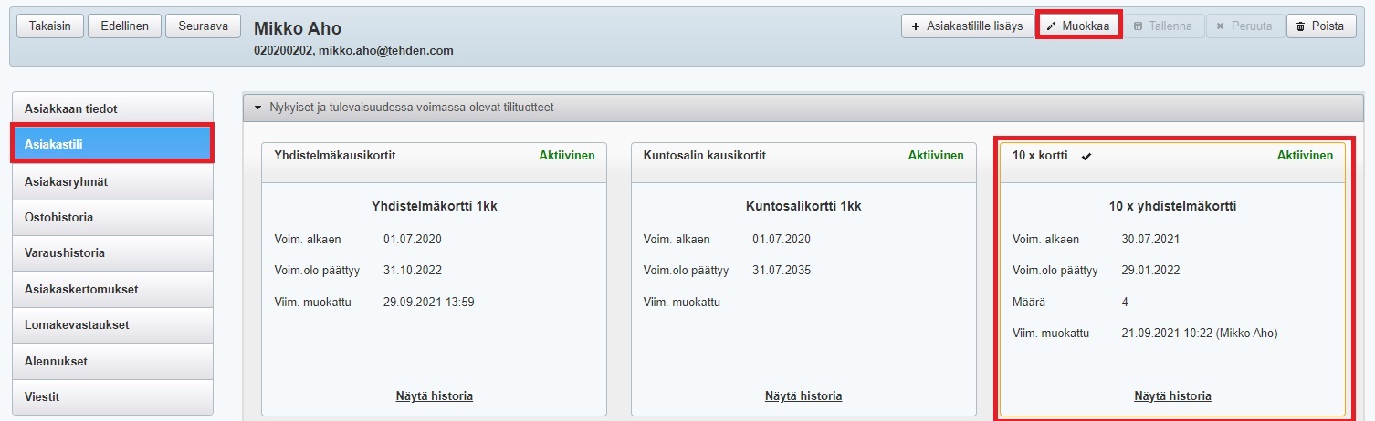 - Etsi asiakas Asiakkaat-ohjelmasta, siirry asiakkaan Asiakastili-välilehdelle, valitse haluamasi sarjakortti (kehys muuttuu oranssiksi) ja klikkaa Muokkaa-painiketta: