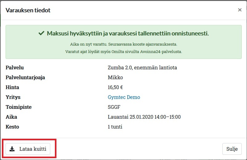 Jos taas maksu onnistuu, asiakas saa sähköpostiinsa varausvahvistuksen. Kuitin asiakas voi ladata itselleen maksamisen jälkeen tai myöhemmin Avoinna24-asiakastililtään: