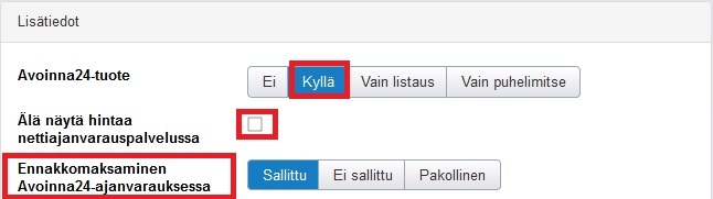 Ajanvarauksen maksaminen aktivoituu vain sellaisille palveluille ja ryhmävarauspalveluille, joille on määritelty tietty hinta. Jos palvelun tyyppi on vapaahintanen palvelu, palvelun tyyppi on muutettava palveluksi, jotta sen voi maksaa Avoinna24:ssä. Jos Hintaa ei näytetä nettiajanvarauksessa -kohta on valittu, ennakkomaksua ei voi sallia, eli muista myös käydä poistamassa rasti tästä kohdasta.