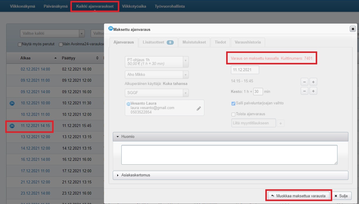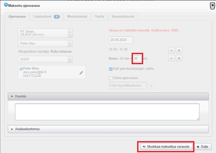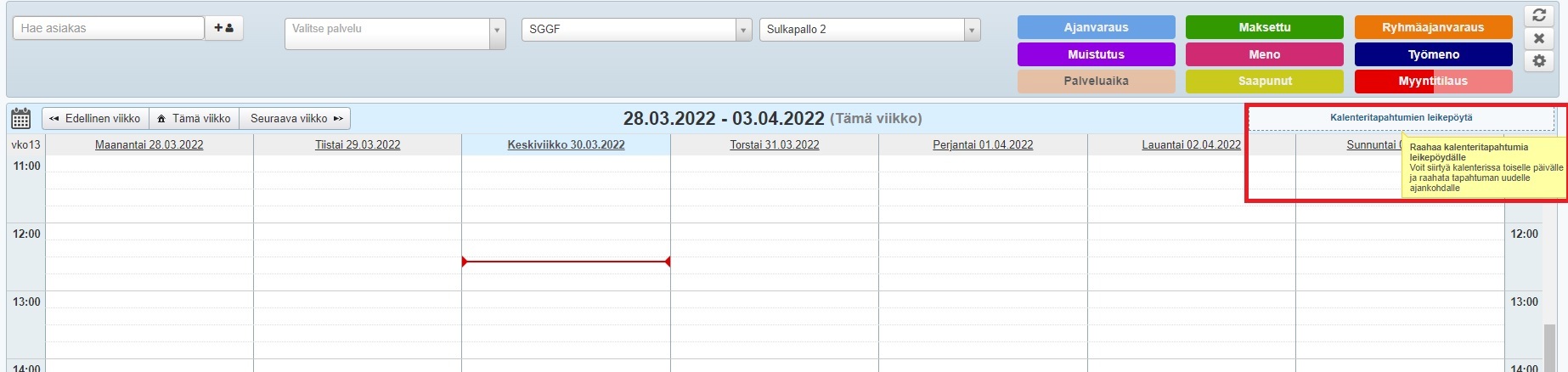 Huom! Jos varaukseen liittyy lisäpalvelu, varausta ei voi siirtää Muokkaa maksettua ajanvarausta -painikkeella, vaan se täytyy siirtää kalenteritapahtumien leikepöydän kautta: