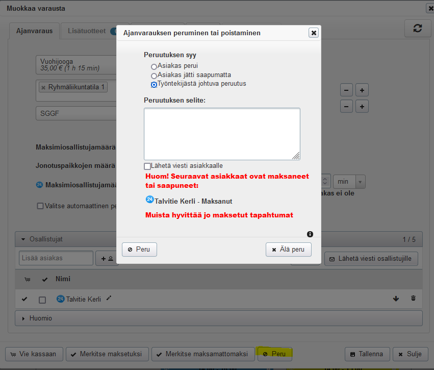 Jos asiakas peruuttaa varauksensa niin myöhään, että ennakkomaksua ei enää palauteta tälle, voidaan varaus perua Tehden-kalenterista Muokkaa maksettua varausta -painikkeen kautta, vaikka maksua ei olisi palautettu. Näin aika/ryhmäajanvarauspaikka vapautuu toisen asiakkaan varattavaksi: