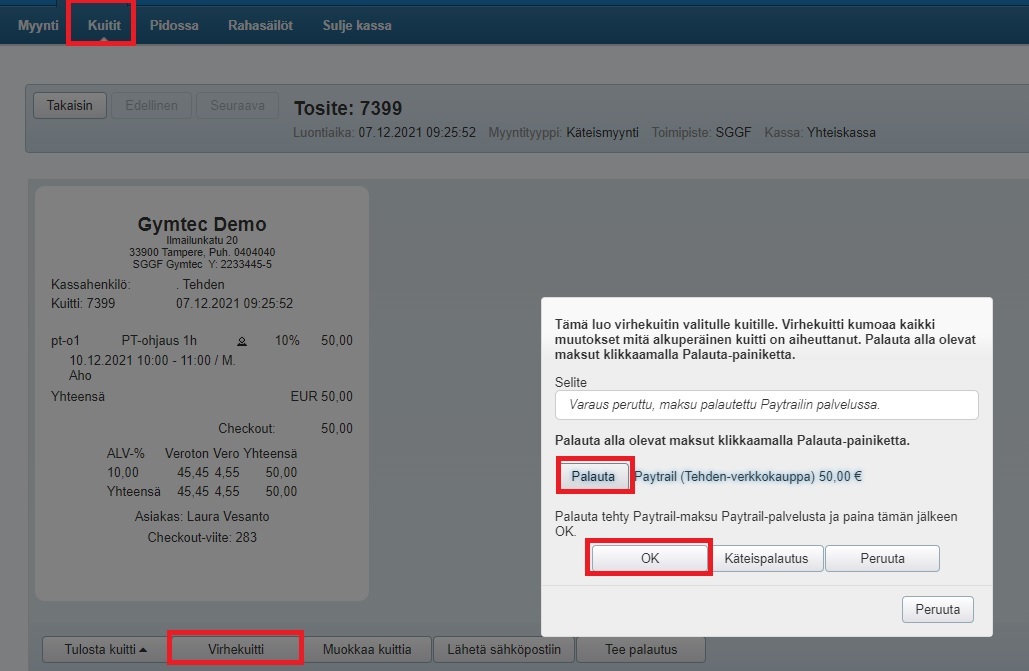 Kun varaus on peruutettu, etsi maksaneiden asiakkaiden kuitit, tee niistä virhekuitit ja siirry Paytrailin palveluun palauttamaan rahat asiakkaille.