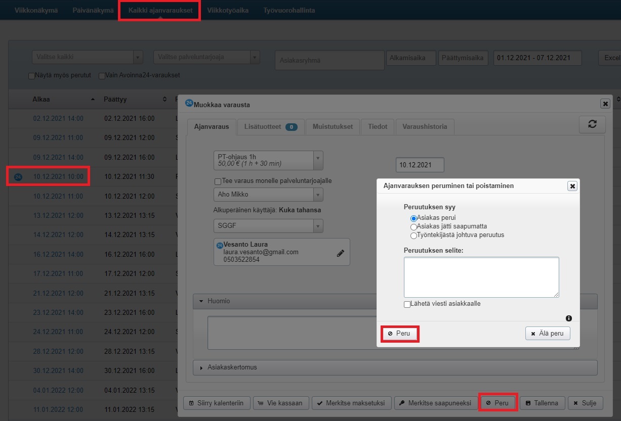Jos asiakas haluaa perua ennakkoon maksetun palvelun/ryhmäajanvarauksen, hän ei voi tehdä sitä itse, vaan hänen on oltava yhteydessä yritykseen.