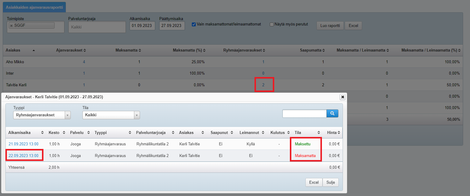 Jos epäillään, että tietyltä asiakkaalta puuttuu kulunvalvontaleimauksia, myös niitä voi lähteä selvittämään asiakkaiden ajanvarausraportin avulla. Voit valita, että raportti näyttää vain ne varaukset, joita ei ole maksettu tai leimattu. Raportille voi ottaa mukaan myös perutut (palveluntarjoajan perumat) varaukset.