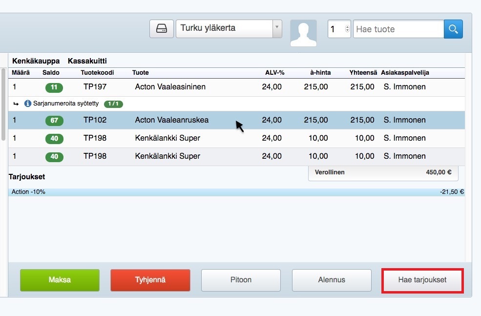 Vaikka et klikkaisi Hae tarjoukset -painiketta, kampanjat huomioidaan kassalla automaattisesti Maksa-painikkeen klikkaamisen jälkeen. Lue lisää: Kampanjat