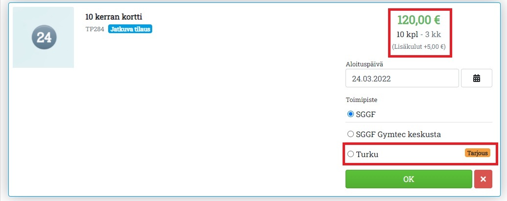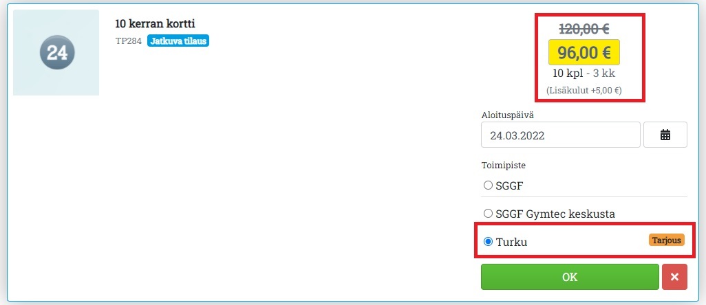- Kampanjan voi kohdistaa vain tiettyihin toimipisteisiin. Tällöin asiakas näkee Avoinna24:ssä Tarjous-tekstistä, missä toimipisteissä tarjous on voimassa. Tuotteen hinta muuttuu alennetuksi vasta silloin, kun asiakas valitsee toimipisteen, jossa tarjous on voimassa: