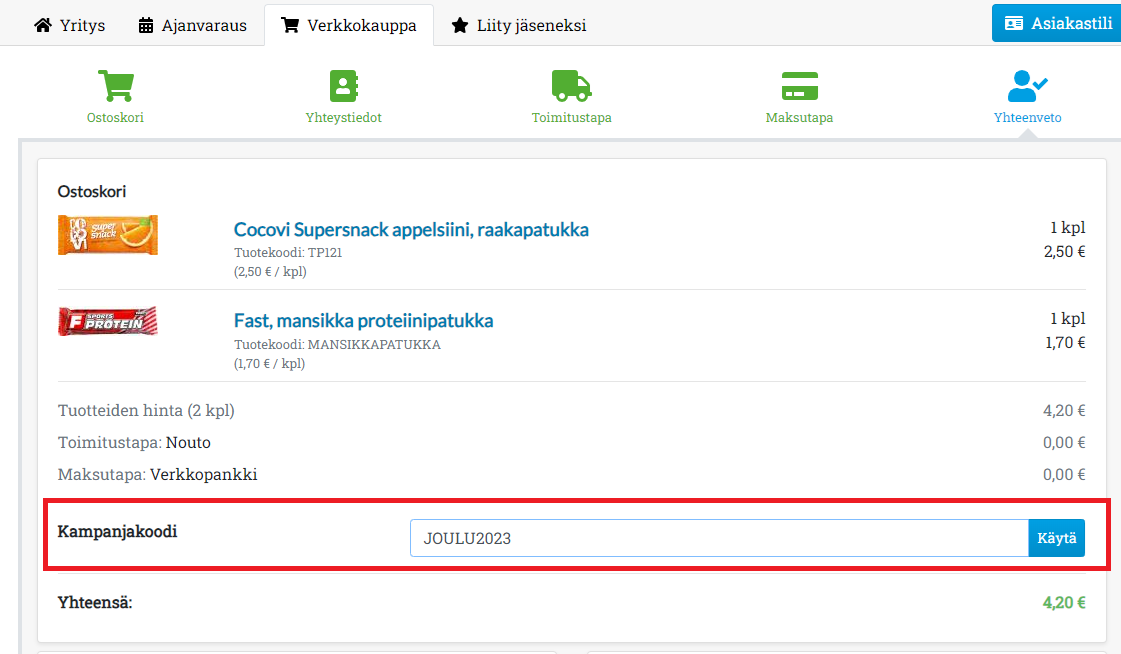 - Huomioi, että kampanjakoodi syötetään vasta yhteenvetovaiheessa, eli kun asiakas on ensin valinnut toimitustavan ja maksutavan.