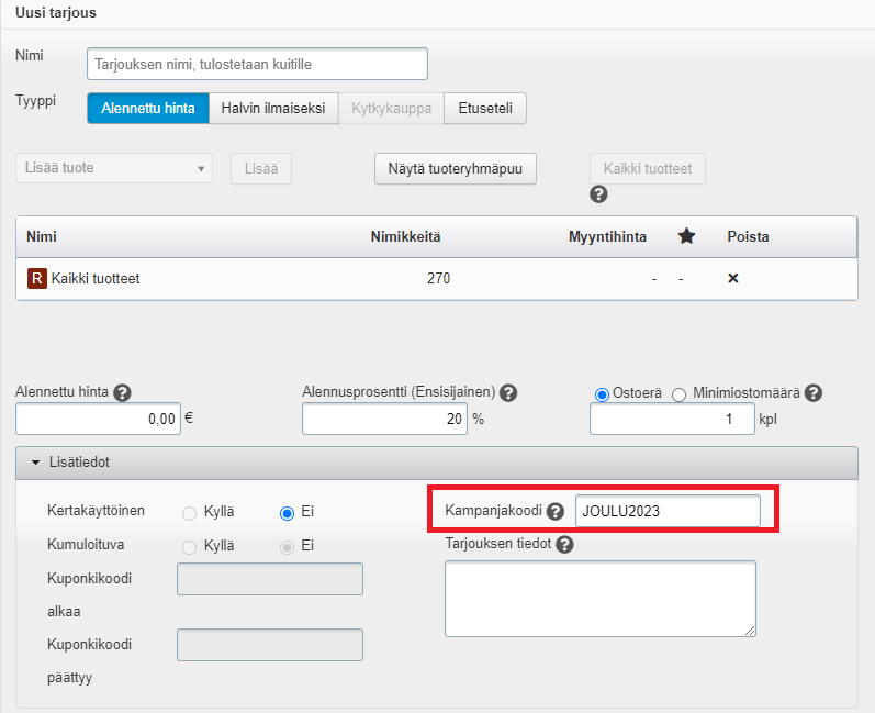 - Kampanjakoodi määritellään kampanjan Lisätiedot-osiossa. Kampanjakoodin voi lisätä erityyppisille tarjouksille (Alennettu hinta, Halvin ilmaiseksi, Kytkykauppa), ja se voi koskea joko tiettyjä tuotteita/palveluita tai yrityksen kaikkia tuotteita (eli koko ostoskorin sisältöä). Tavallisin käyttötapa on tarjota kampanjakoodilla euro- tai prosenttimääräistä alennusta hintaan.
