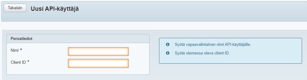 Aukeavalla sivulla API-käyttäjälle annetaan vapaavalintainen nimi sekä syötetään client ID. Client ID on Tehdenin rajapintavastaavan luoma tunnus, jonka saat integraation toteuttajalta.