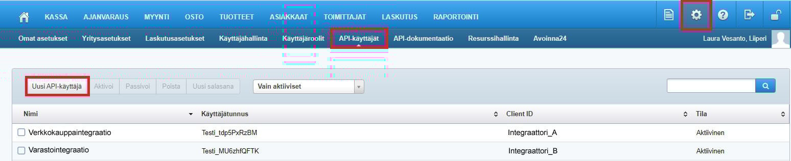 Huom! Jos API-käyttäjän luoneen pääkäyttäjän oikeuksia rajataan jälkeenpäin tai pääkäyttäjä passivoidaan tai poistetaan, tämä saattaa estää API-käyttäjän pääsyn rajapintaan. Tällaisessa tilanteessa yrityksen nykyisen pääkäyttäjän on luotava API-käyttäjä uudestaan kuten edellä ohjeistettu, ja uudet tunnukset lähetetään integraattorille.