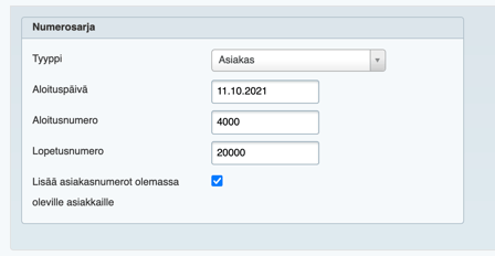 - Asiakasnumerot lisätään olemassa oleville asiakkaille vanhimmasta luontiajasta alkaen (eli asiakkaan tiedoissa Luotu-kentässä olevan ajan perusteella).