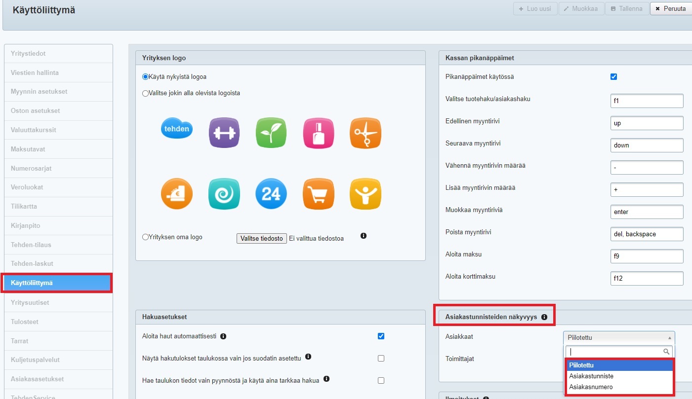 Siirry kohtaan Asetukset / Yritysasetukset / Käyttöliittymä ja valitse, miten haluat asiakastunnisteiden näkyvän ohjelmassa:
