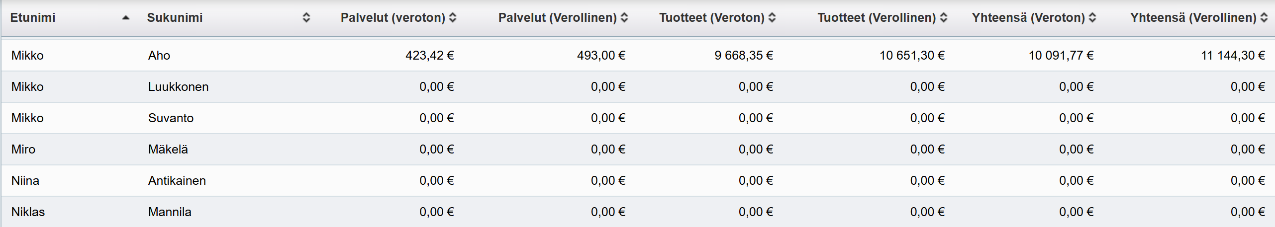Raportilta saa haluamaltaan ajanjaksolta kaikkien yrityksen asiakaspalvelijoiden palvelu- ja tuotemyynnin verottoman ja verollisen määrän. Huomioi, että asiakaspalvelijoiden myyntiraportti ei huomioi asiakaspalvelijoiden palveluita, jotka on maksettu lahjakortilla, mutta tilimyynnillä maksetut palvelut huomioidaan. Huomioi myös, että asiakaspalvelijoiden myyntiraportti huomioi tuotemyynnissä Vapaa hyvitys -tyyppiset tuotteet, vaikka ne eivät olekaan varastotuotteita.