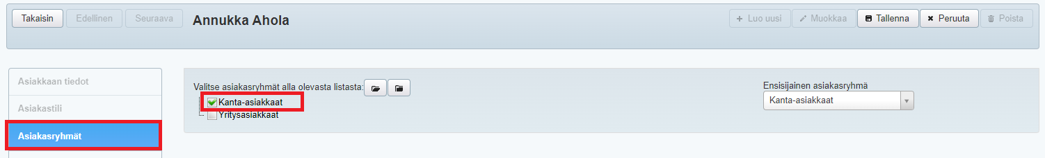Asiakasryhmää ei voi poistaa, jos ryhmässä on asiakkaita. Jos haluat poistaa asiakasryhmän, siirrä ryhmässä olevat asiakkaat ensin toiseen asiakasryhmään.