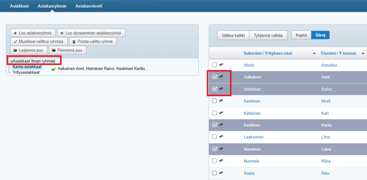 - Tartu hiirellä jonkin valitun asiakkaan nimen edessä näkyvään tuplanuolikuvakkeeseen ja raahaa asiakkaat vasemman laidan asiakasryhmäpuun kohdalle. Kun hiiri on Asiakkaat ilman ryhmää -ryhmän kohdalla ja hiiren kursori muuttuu vihreäksi, pudota asiakkaat ryhmään: