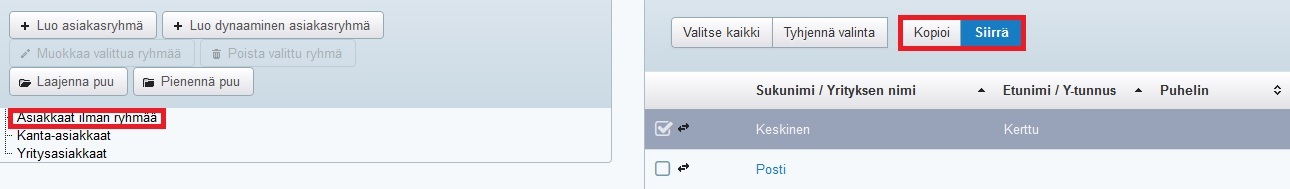 - Voit myös siirtää asiakkaita ryhmästä toiseen em. tavalla. Jos taas haluat kopioida asiakkaita toiseen ryhmään siten, että asiakkaat säilyvät myös alkuperäisessä ryhmässä, valitse asiakaslistauksen yläpuolelta Kopioi-toiminto ja toimi sitten em. ohjeiden mukaan: