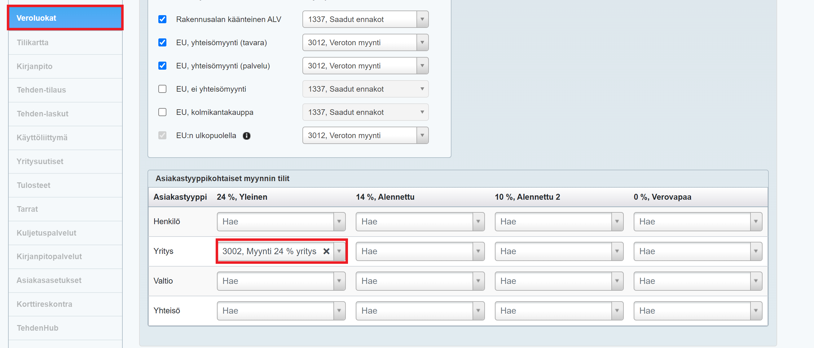 Tehdenin Yritysasetusten Veroluokat-välilehdellä määritellään myynnissä ja ostoissa sallitut veroluokat, käytössä olevat ALV-käsittelyt sekä myös asiakastyyppikohtaiset myynnin tilit. Asiakastyyppikohtainen myynnin tili tarkoittaa sitä, että myynti kirjautuu tietylle kirjanpitotilille sen mukaan, mihin Tehdenin asiakastyypeistä (henkilö, yritys, yhteisö tai valtio) asiakas kuuluu. Asiakastyyppi määritellään asiakkaan tiedoissa. Yritys voi ottaa käyttöön vain tietyn asiakastyyppikohtaisen myynnin tilin eli seurata erikseen esimerkiksi vain yhteisöasiakkaiden myyntiä.