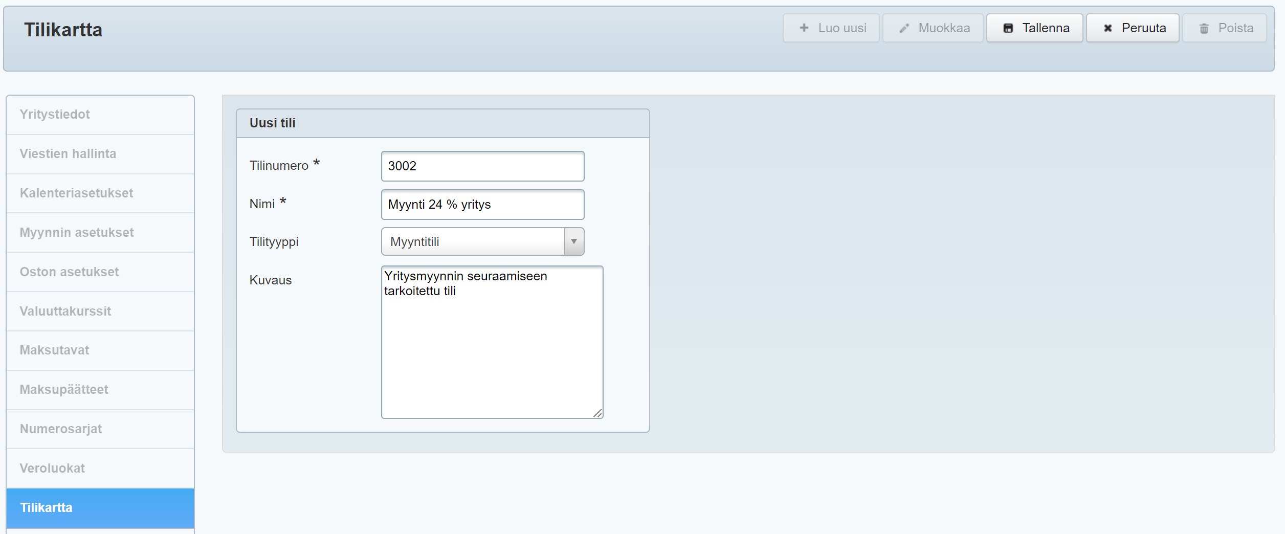 - Luo ensin Tilikartta-välilehdellä uudet kirjanpitotileille. Jos yrityksesi myy eri verokantojen tuotteita, kannattaa luoda oma tilinsä kullekin näistä: