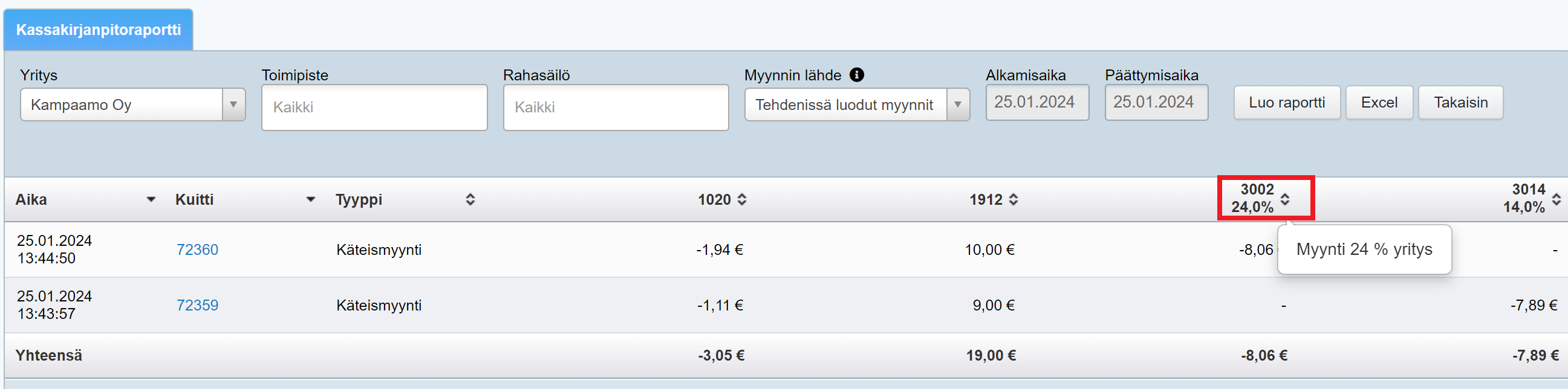 - Nyt Veroluokat-välilehdellä asetetut myyntitilit ovat voimassa, ja määrittelemiisi asiakastyyppeihin kuuluvien asiakkaiden myynnit kirjautuvat esim. kassakirjanpitoraportilla tässä määritellyille tileille (ellei myyntiin kohdistu jotain muuta tiliöintisääntöä). Jos esimerkiksi yritysasiakkaille on valittu oma tilinsä ja Yritys-tyyppiselle asiakkaalle tehdään myynti kassalla, näyttää se raportilla tältä:
