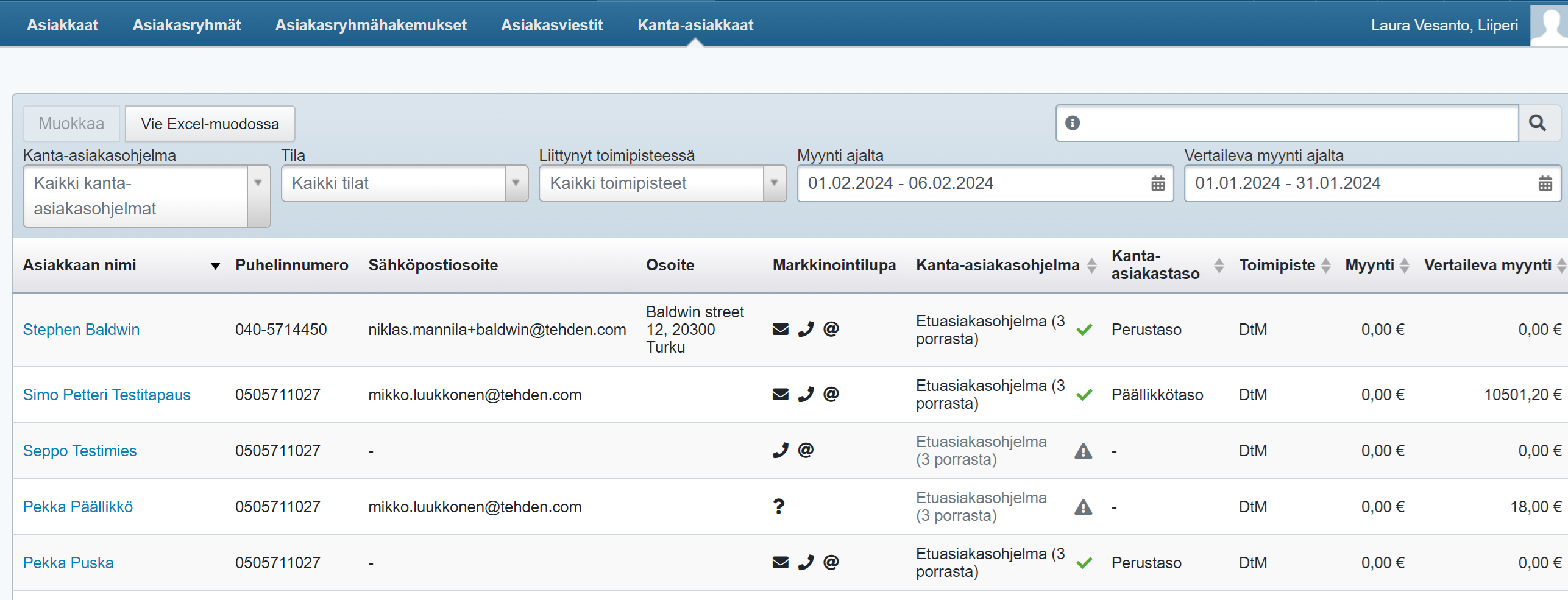Taulukko kokoaa kanta-asiakkaiden tiedot yhteen näkymään, ja taulukko tarjoaa myös mahdollisuuden vertailla kanta-asiakkaiden myyntejä eri ajanjaksojen välillä. Näkymää voi suodattaa kanta-asiakkuuden erilaisten mahdollisten tilojen perusteella (esim. onko ehdot hyväksytty, kutsu vanhentunut, kanta-asiakkuus peruutettu jne.) ja myös sen perusteella, missä toimipisteessä asiakas on liittynyt kanta-asiakkaaksi.