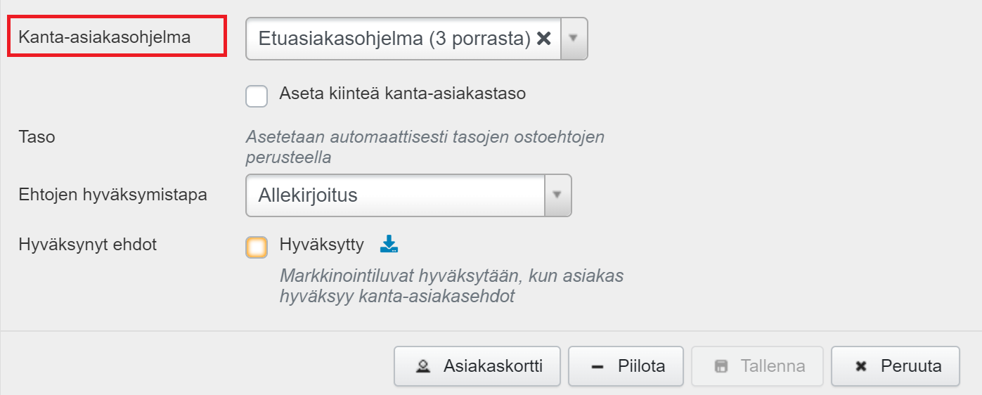 Asiakkaan asiakaskortilla on Kanta-asiakas-osio, jossa voidaan muokkaustilassa valita ohjelma ja määritellä tiedot kuten kassalla/myyntitilauksella.