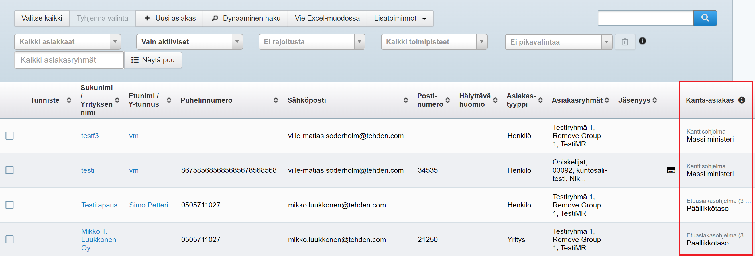 Tieto asiakkaan kanta-asiakkuudesta ja sen tilasta löytyy myös Asiakkaat-ohjelman etusivun listauksesta: