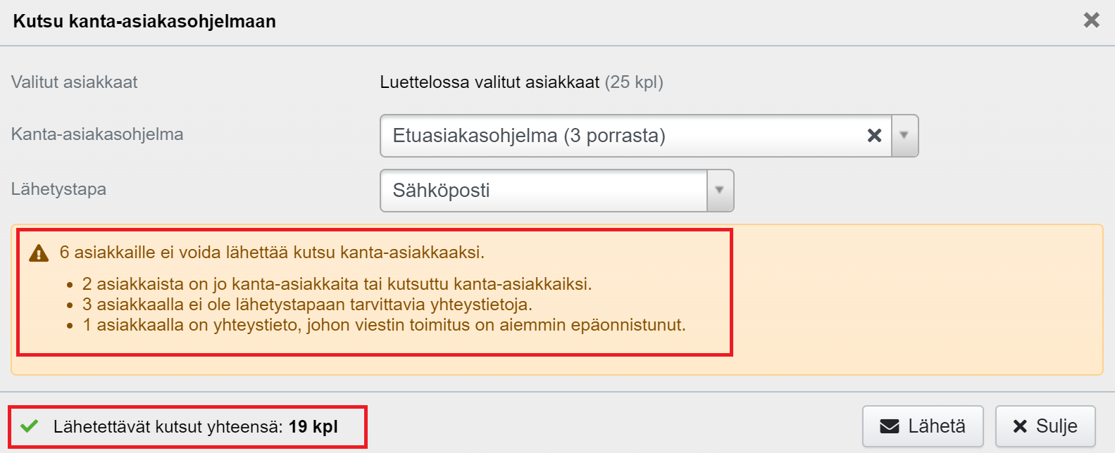 - Tehden näyttää myös yhteenvedon siitä, monelleko asiakkaalle kutsu lähetetään, moniko valituista on jo kanta-asiakas ja kuinka monelle ei voida lähettää kutsua esim. puutteellisten markkinointilupien tai puuttuvan sähköpostiosoitteen vuoksi: