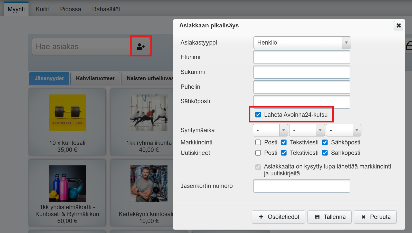 Sama valinta löytyy myös asiakkaan pikalisäyksessä (kassalla tai ajanvarauksessa):