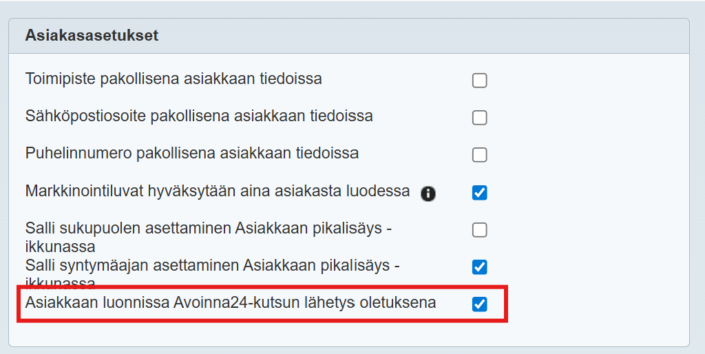 Tehdenin Yritysasetusten Asiakasasetukset-välilehdellä voi määritellä, onko Lähetä Avoinna24-kutsu -kohta oletuksena valittu, kun Tehdeniin luodaan uutta asiakasta: