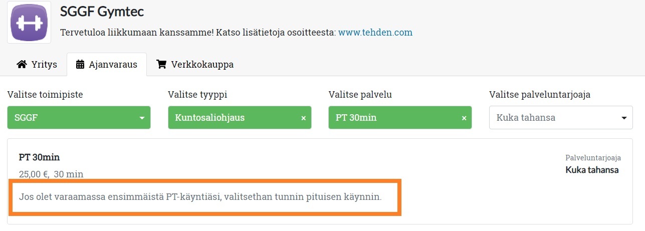 - Nimeä palvelu osuvasti. Nimen avulla asiakas löytää (myös kestoltaan) oikean palvelun (esim. ”PT-ohjaus 1h” tai ”Peräkoukun asennus”). Jos palvelulla on pitkä nimi, tarkista miltä se näyttää nettiajanvarauksessa, ja tarvittaessa muokkaa nimeä Tuotteet-ohjelmassa.