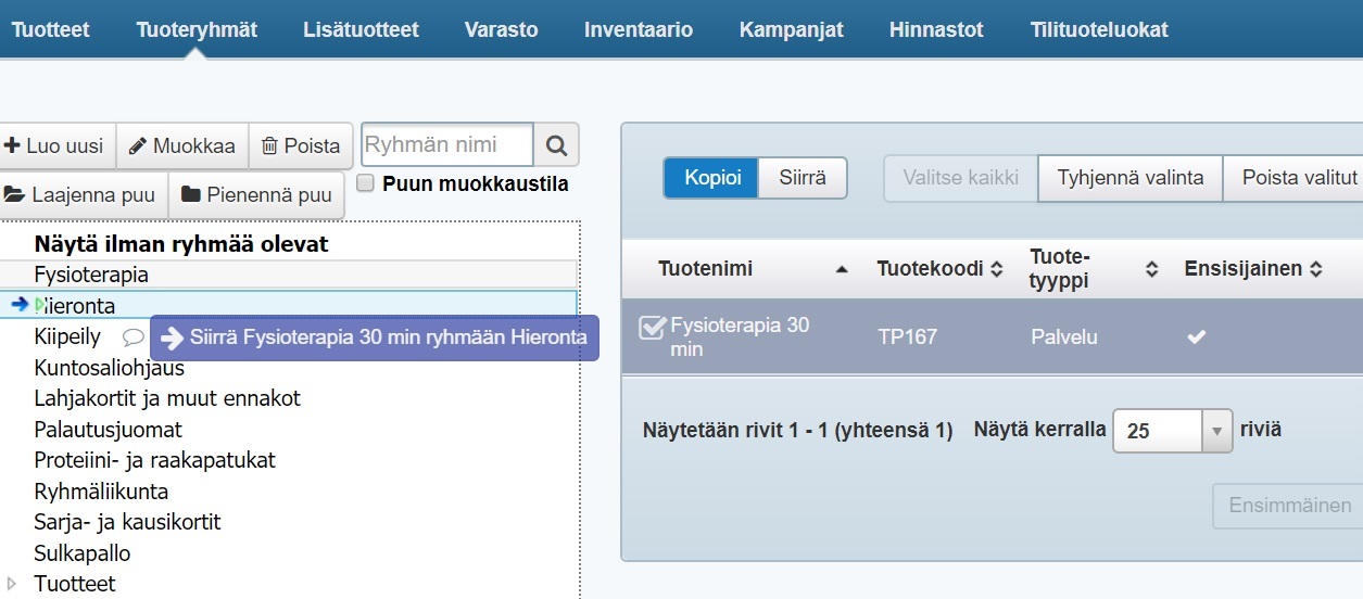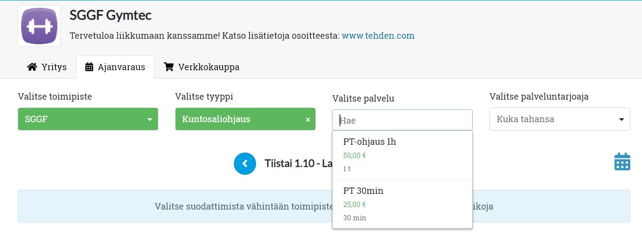 - Ryhmittele palvelut toimipisteen mukaan. Toimipiste voi olla fyysisesti eri toimipiste tai esimerkiksi samassa liiketilassa toimiva eri osasto (esim. kuntosali, ryhmäliikuntasali ja solarium). Mieti, mikä ryhmittely on asiakkaidesi kannalta toimivin!