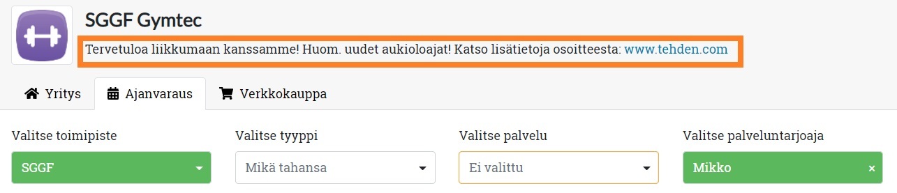 - Tiedota ajankohtaisista asioista ajanvaraussivulla. Ajanvarauskalenterin ylälaidassa voit kertoa asiakkaillesi uusista palveluista, poikkeusaukioloista tai muista ajankohtaisista asioista. Lisää teksti internet-ajanvarauksen asetuksissa.