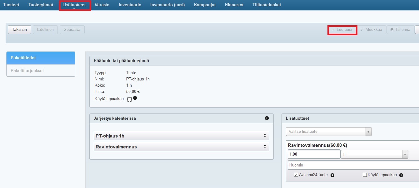 - Tarjoa asiakkaalle lisäpalveluita ja -tuotteita, jotka on helppo varata varsinaisen palvelun kanssa samalla ajanvarauksella. Luo lisätuotteet Tuotteet-ohjelmassa ja liitä ne yksittäiseen tuotteeseen tai koko tuoteryhmään: