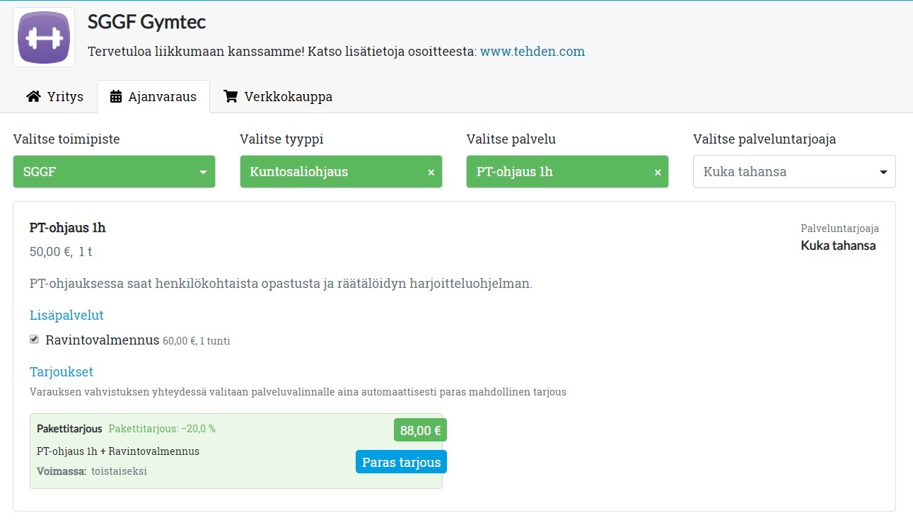 - Luo kytkykauppatarjouksia. Asiakas saa alennuksen, kun varaa tietyn lisäpalvelun varsinaisen palvelun yhteydessä. Myös tuote voi olla osana kytkykauppaa (esim. ”Lisäravinne -20 % vain netistä varatun PT-käynnin yhteydessä”).