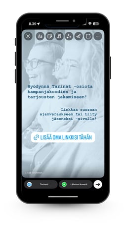 Voit markkinoida tiettyä palvelua, jäseneksi liittymistä tai verkkokaupan tuotteita jakamalla suoran linkin esimerkiksi Instagramissa tai Facebookin Tarinat-osiossa. Tältä suora linkki näyttää Instagramin Storyssä: