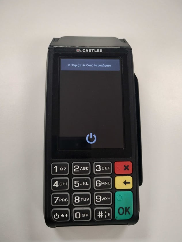 2. Kun maksupäätteen näytölle ilmestyy teksti "Tap (or <- Corr) to configure", napauta joko näytön alareunan virtapainiketta tai keltaista nuolinäppäinpainiketta.