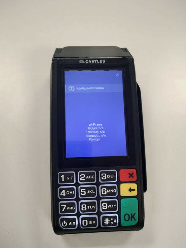 7. Kun langattoman verkon asetukset on tallennettu, palautuu maksupäätteen näyttö oletusnäkymään (saattaa ladata jonkin aikaa). Napauta vasemman alareunan virtapainiketta, niin saat näkyviin alla olevan kuvan mukaisen asetussivun. Asetussivusta kannattaa ottaa kuva, se pysyy näkyvillä vain muutaman sekunnin.