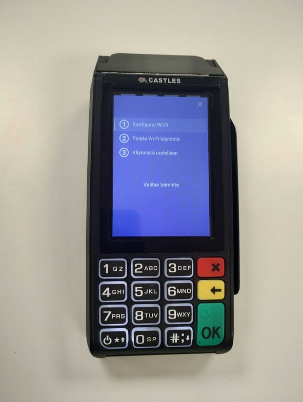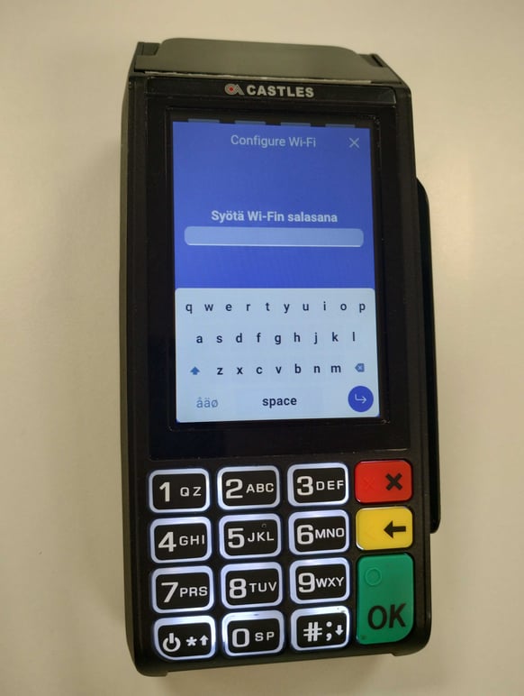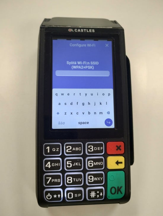 5. Syötä maksupäätteen näppäimistöön langattoman verkon nimi (samoin kuin se on nimetty esim. tietokoneellasi näkyvissä verkoissa) ja siirry eteenpäin näytön oikean alareunan sinisestä nuolipainikkeesta.