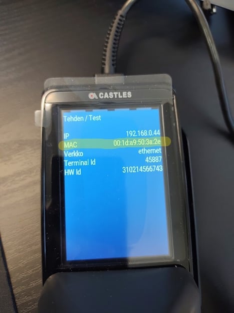 Kun olette saaneet oikean MAC-tunnuksen, lähettäkää tämä, sekä maksupäätteen asetussivun alimpana listattu HW Id -tunnus toimipisteen tiedoilla Tehdenin tukeen osoitteeseen tuki@tehden.com