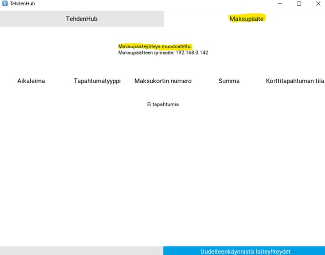 4. Käynnistä TehdenHub -ohjelma uudestaan ja päivitä Tehdenin kassanäkymä. Voit tarkistaa onko maksupääte muodostanut yhteyden joko katsomalla TehdenHubin maksupäätevälilehdeltä tai tekemällä testimaksun kassalla: