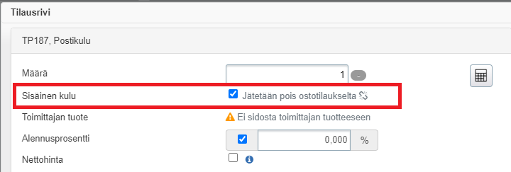 - Voit lisätä crossdocking-tilaukselle toimituskulujen lisäksi myös sisäisiä kuluja, joita ei haluta kopioida ostotilaukselle. Tällaista kulua varten luodaan ensin Tehdeniin myyntituote tai vapaahintainen myyntituote. Kun lisäät tuotteen myyntitilaukselle, valitse Sisäinen kulu -kohta: