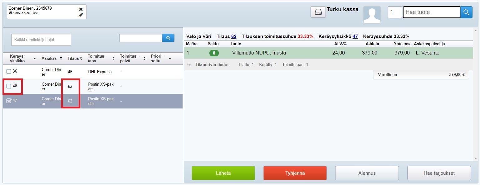 Siirryt lähettämöön, jossa oikea asiakas on valittuna, ja voit lähettää tuotteet asiakkaalle. Jos asiakkaalla on muita lähettämistä odottavia keräysyksiköitä, voit lisätä ne samaan lähetykseen: