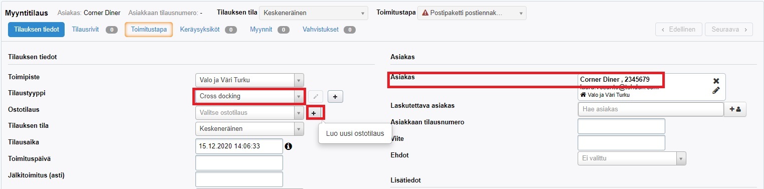 - Valitse tilaustyypiksi Cross docking.
