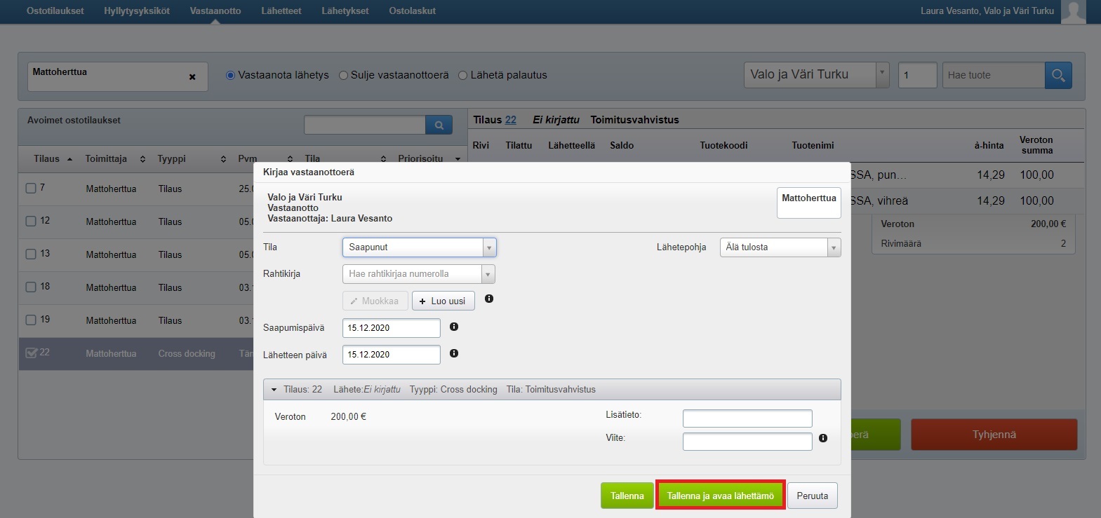 Kun tilatut tuotteet saapuvat toimittajalta, vie ostotilaus vastaanottoon ja kirjaa vastaanottoerä. Jokaisesta toimittajan kollitunnisteesta luodaan automaattisesti oma hyllytys- ja keräysyksikkönsä. Klikkaa sitten Tallenna ja avaa lähettämö -painiketta: