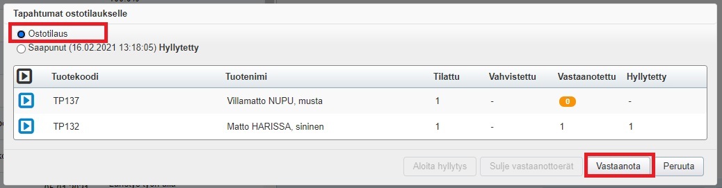 Jos haluat toimittaa tuotteet asiakkaalle vasta jälkitoimituksen saavuttua, vie ensin saapuneet tuotteet vastaanottoon ja tallenna siirtymättä lähettämöön. Osto- ja myyntitilauksen tilaksi tulee nyt Lähetys työn alla. Kun jälkitoimitus saapuu, etsi oikea ostotilaus ja klikkaa Vie vastaanottoon -painiketta. Näet aukeavassa ikkunassa ostotilauksen tapahtumat, eli vastaanotetut ja vastaanottamattomat tuotteet. Valitse ylälaidasta Ostotilaus ja klikkaa sitten Vastaanota-painiketta: