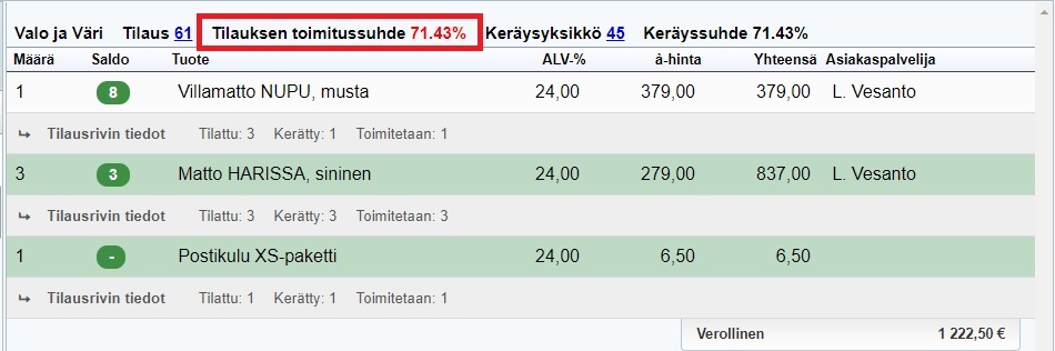 Tee myynti- ja ostotilaukset edellisen ohjeen mukaan. Kun osa tilatuista tuotteista saapuu, vie ostotilaus vastaanottoon ja vaihda lähetteellä olevien tuotteiden määrä toimitusta vastaavaksi. Jos haluat lähettää jo saapuneet tuotteet heti, vie tilaus lähettämöön. Tilauksen toimitussuhde kertoo, että osa tilatuista tuotteista puuttuu: