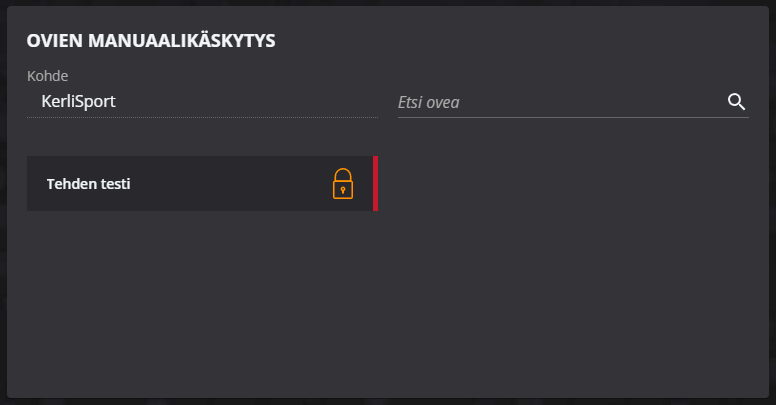 Etusivu-osiossa tärkeimpänä on ovien manuaalikäskytys. Kohdevalikosta voi valita halutun toimipisteen, jonka jälkeen alle tulevat kaikki kyseisen toimipisteen ovet. Muista kertoa konfiguroijalle kuvaavat nimet oville, jotta osaat erottaa ne toisistaan. Ovi on merkitty joko punaisella tai vihreällä. Punainen = lukossa, Vihreä = auki